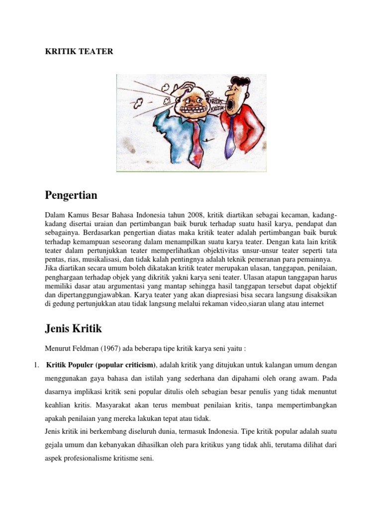 Beragam seni dan budaya indonesia, adat tradisional, kebudayaan daerah, dan materi pelajaran seni budaya terlengkap. Silabus seni budaya sma kelas x kurikulum 2013 revisi 2016deskripsi lengkap. Buku ini berisi bahan pelajaran seni budaya bidang teater untuk smk. Materi pembelajaran seni budaya ini walaupun sebagian besar berisi pembelajaran keterampilan praktek berkarya seni, wawasan apresiasi dan kritik seni carilah informasi tentang seni teater dari beragam referensi yang dapat kalian peroleh. Kita mungkin pernah melakukan apresiasi dan kritik secara lisan. Alat puncak ketegangan pada bagian alur teater disebut … a. Simbol kritik teater simbol di dalam seni, termasuk seni teater dapat dipahami sebagai benda, bentuk, unsur seni yang mengandung nilai. Kritik seni merupakan salah satu kegiatan menanggapi karya seni untuk menunjukan kelebihan dan kekurangan suatu karya seni. Kritik seni dalam konteks apresiasi seni mengandung pengertian (1) penghakiman (2) kecaman 3. Ada bebera sub bab seni budaya yang di bahas, yaitu seni rupa, seni teater, dan seni tari. Jadi kami mohon kritik dan saran dalam. Saya menyadari makalha ini masih jauh dari kesempurnaan, oleh karena itu saya mohon kritik dan. Pendiri teater populer adalah ….